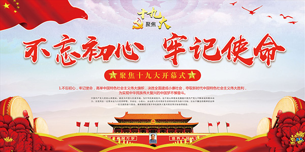不忘初心,牢記使命,高舉中國(guó)特色社會(huì)主義偉大旗幟,決勝全面建成小康社會(huì),奪取新時(shí)代中國(guó)特色社會(huì)主義偉大勝利,為實(shí)現(xiàn)中華民族偉大復(fù)興的中國(guó)夢(mèng)不懈奮斗。